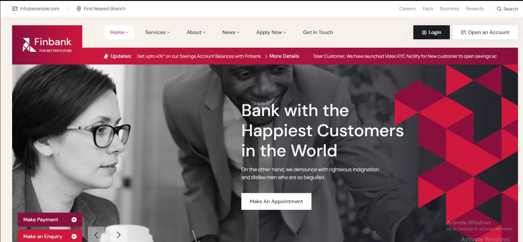 Finbank adalah tema WordPress Keuangan yang responsif dan dilengkapi dengan opsi tema. Tema ini sempurna untuk memamerkan layanan keuangan perusahaan Anda, baik Anda merupakan bank atau perusahaan asuransi. Tema ini mencakup beragam fitur yang cocok untuk semua jenis perusahaan.