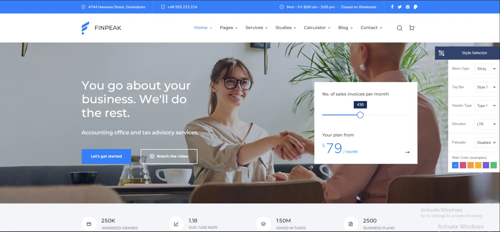 Finpeak adalah tema WordPress yang difokuskan pada keuangan, dirancang khusus untuk akuntan dan para profesional keuangan lainnya. Kemudahan penggunaan dan beragam pilihan kustomisasi menjadikannya pilihan yang sangat baik untuk membuat situs web yang berhubungan dengan keuangan, baik untuk penggunaan pribadi maupun komersial.