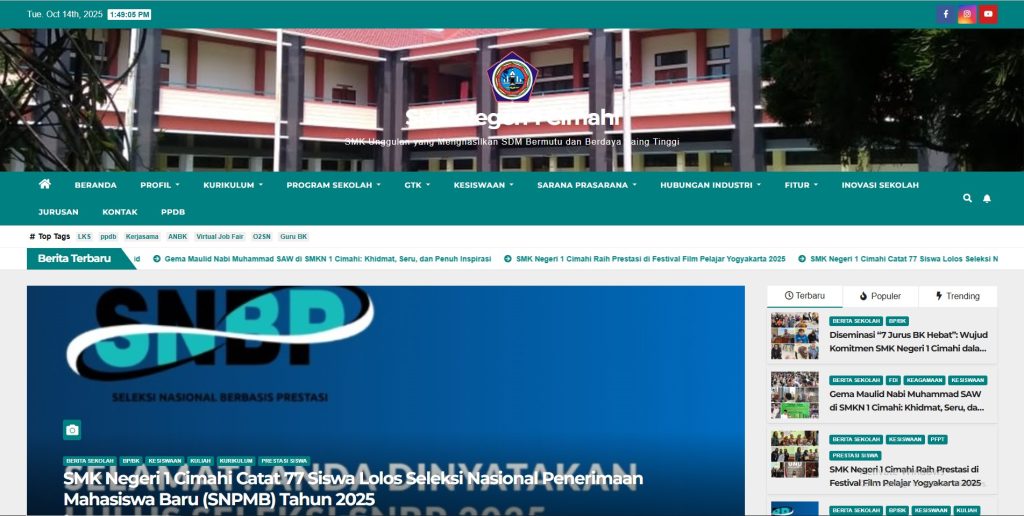SMK Negeri 1 Cimahi menunjukkan kekuatan desain informatif dengan UI yang efisien dan UX yang fokus pada kebutuhan pengguna. Loading cepat dan layout responsif mencerminkan karakter SMK unggulan yang siap bersaing di era digital, sekaligus menegaskan citra sekolah yang adaptif terhadap teknologi 2025. (smkn1-cmi.sch.id)